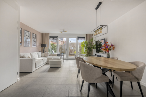 Aansluitend ligt de leefkeuken van bijna 16 m². Dit is precies het soort ruimte dat je als gezin dagelijks gebruikt: een plek waar een royale eettafel moeiteloos past, waar je samen eet, waar kinderen aan tafel tekenen of huiswerk maken en waar je als ouder kookt zonder “weg” te zijn van de rest. De keuken is uitgevoerd in hoekopstelling en voorzien van een vaatwasser, een 1¼ spoelbak met eengreepskraan, close-in boiler, 4-pits inductiekookplaat met afzuigkap, koelkast, oven en magnetron. Onder- en bovenkasten zorgen voor veel bergruimte.